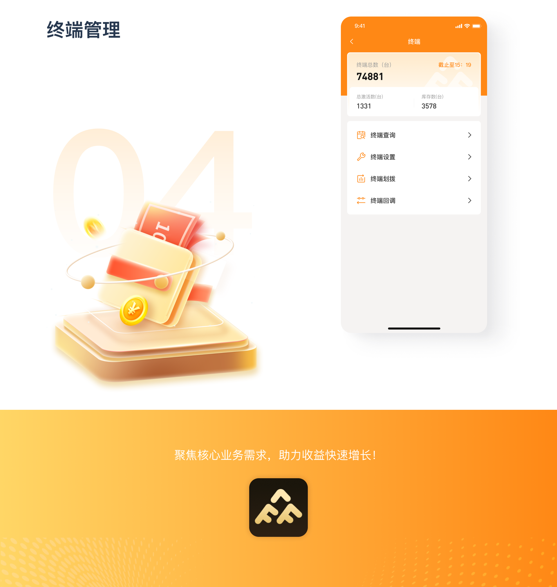 可实时查看交易额、终端在库数、本月新增商户数、总服务商人